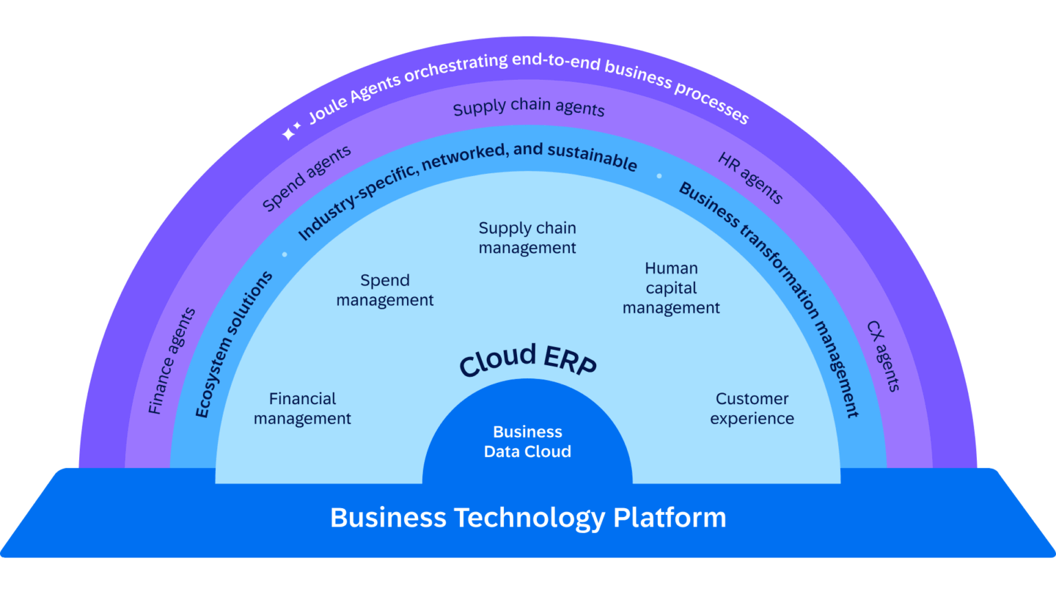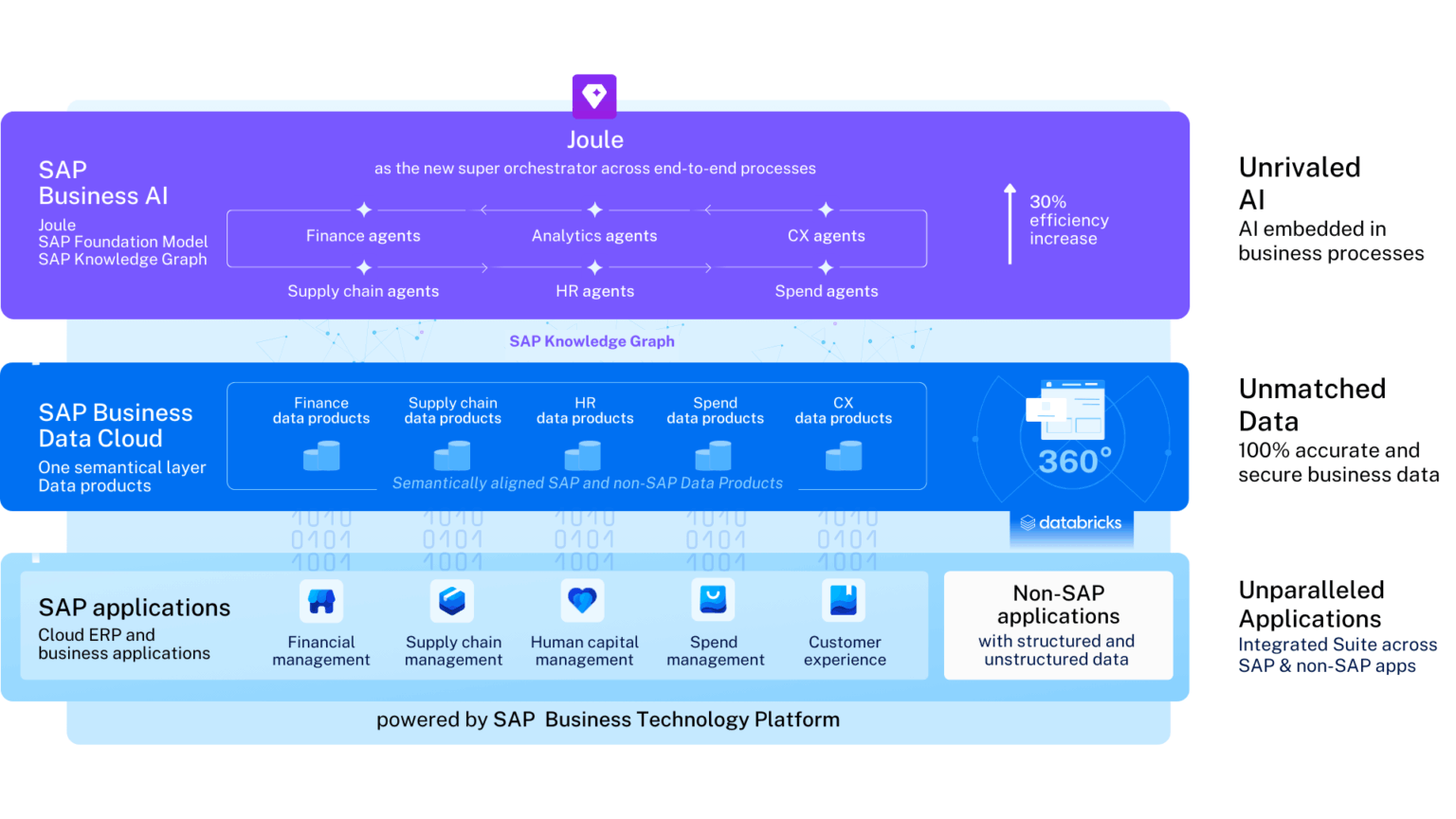 - Với SAP Business AI (Joule, SAP Foundation Model, SAP Knowledge Graph), người dùng có cho mình một trợ lý AI thông minh để hỗ trợ đẩy nhanh các quy trình từ đầu đến cuối. Các “AI Agent” chuyên biệt cho tài chính, chuỗi cung ứng, nhân sự, chi tiêu và trải nghiệm khách hàng giúp nâng cao hiệu suất vận hành lên đến 30%.