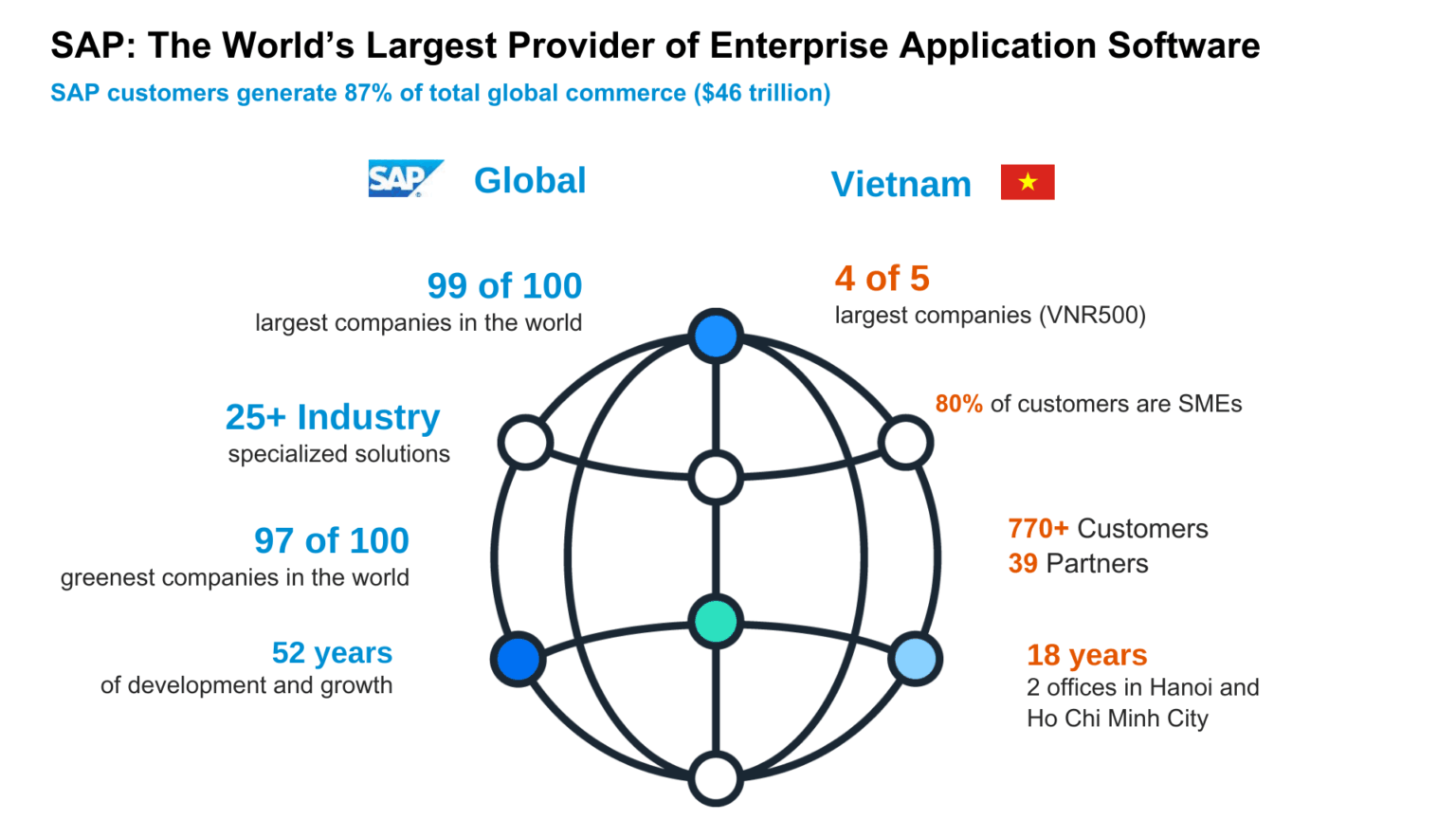 Với hơn 52 năm phát triển, SAP đã trở thành lựa chọn đáng tin cậy của các tập đoàn và doanh nghiệp trên toàn cầu, cung cấp 25+ giải pháp chuyên biệt cho từng ngành. Tại Việt Nam, SAP sở hữu 2 văn phòng tại Hà Nội và TP. HCM, và đã cùng hơn 39 đối tác chiến lược mang đến giải pháp chuyển đổi số hiệu quả cho hơn 770 doanh nghiệp. Có đến 80% trong số đó là doanh nghiệp SMEs, khẳng định cam kết lâu dài của SAP trong việc hỗ trợ doanh nghiệp tăng trưởng bền vững, hội nhập toàn cầu.