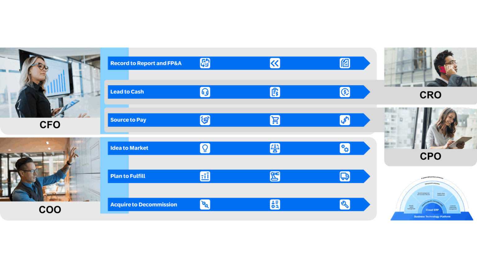 CFO (Chief Financial Officer) có thể quản lý tài chính toàn diện với các quy trình từ Record to Report, Lead to Cash, Source to Pay, giúp tối ưu hiệu suất tài chính và đảm bảo tính minh bạch.