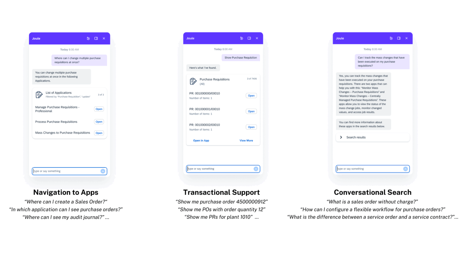 Trợ lý AI Joule của SAP mang đến trải nghiệm người dùng hoàn toàn mới trong SAP S/4HANA Cloud Public Edition bằng cách ứng dụng AI tạo sinh (generative AI), giúp người dùng thực hiện các tác vụ hàng ngày hiệu quả hơn. Để trao đổi với Joule, người dùng chỉ cần sử dụng ngôn ngữ tự nhiên, chẳng hạn như đưa câu lệnh “Cho tôi xem đơn đặt hàng số 4500000912”.